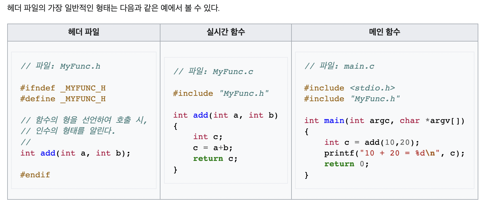 C와 C++ 프로그래밍 언어에서, 표준 라이브러리 함수는 전통적으로 헤더 파일 안에서 선언되어 있다. C 표준 라이브러리와 C++ 표준 라이브러리에 많은 함수들이 존재한다. 함수들은 사용자가 API 수준에서 알아야 한다. 따라서 개발 도구를 만드는 입장에서, 함수 자체를 설계하고 코딩을 한 측에서 제공해야 한다. 라이브러리 오브젝트 코드는 파일로 존재하고 헤더 파일에 함수나 변수의 형이 선언되어 있으므로 사용자 측에서 붙여 사용하면 된다. 사용자 측에서 사용한 라이브러리는 라이브러리 파일의 코드를 링커가 응용 프로그램에 붙여 전체 실행 코드가 완성된다. 결국 헤더 파일의 형을 사용하여 라이브러리 사용자의 인클루드에 의해 함수 호출이 방식이 결정된다.