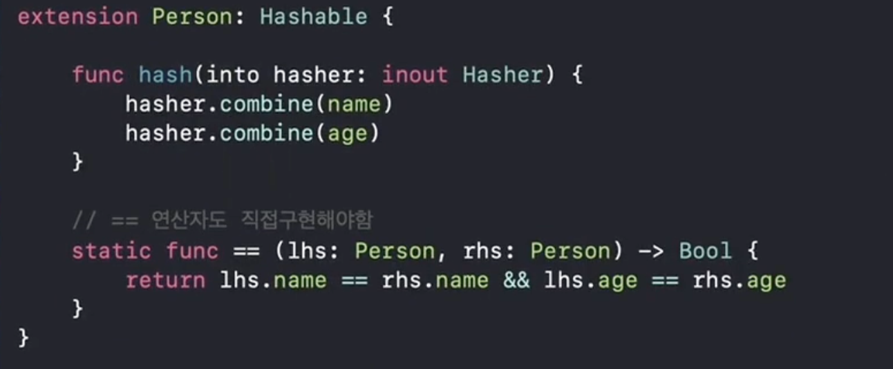 구조체: hashable프로토콜만 채택하고 상세 구현은 선택