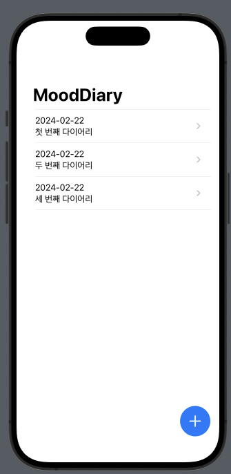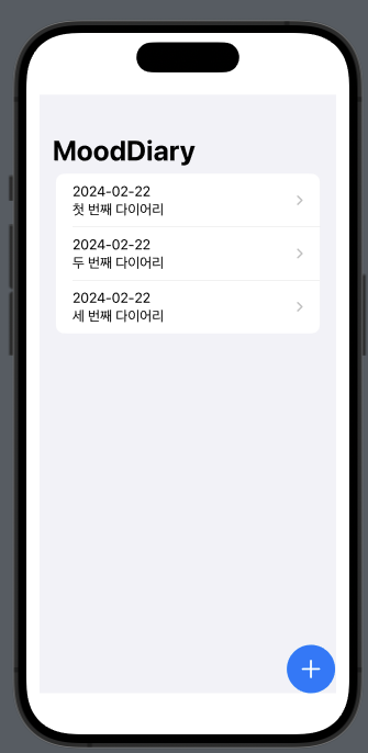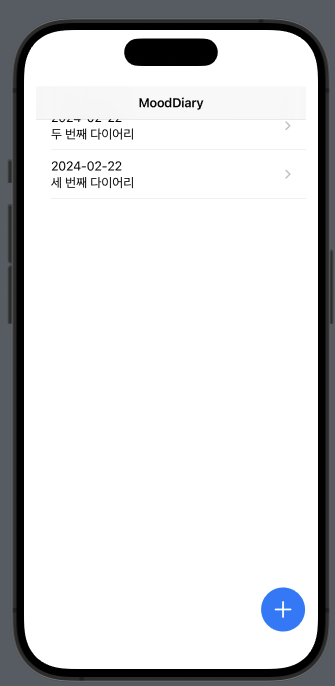 struct ContentView: View { @State var diaryStore:DiaryStore = DiaryStore() var body: some View { NavigationStack{ ZStack { ListView(diaryStore: $diaryStore) VStack { Spacer() HStack { Spacer() Button(action: { print("플로팅 버튼이 클릭되었습니다.") }) { Image(systemName: "plus") .font(.title) .padding() .background(Color.blue) .foregroundColor(.white) .clipShape(Circle()) } } } } .navigationTitle("MoodDiary") } .padding() } }listStyle을 inset으로 설정하기